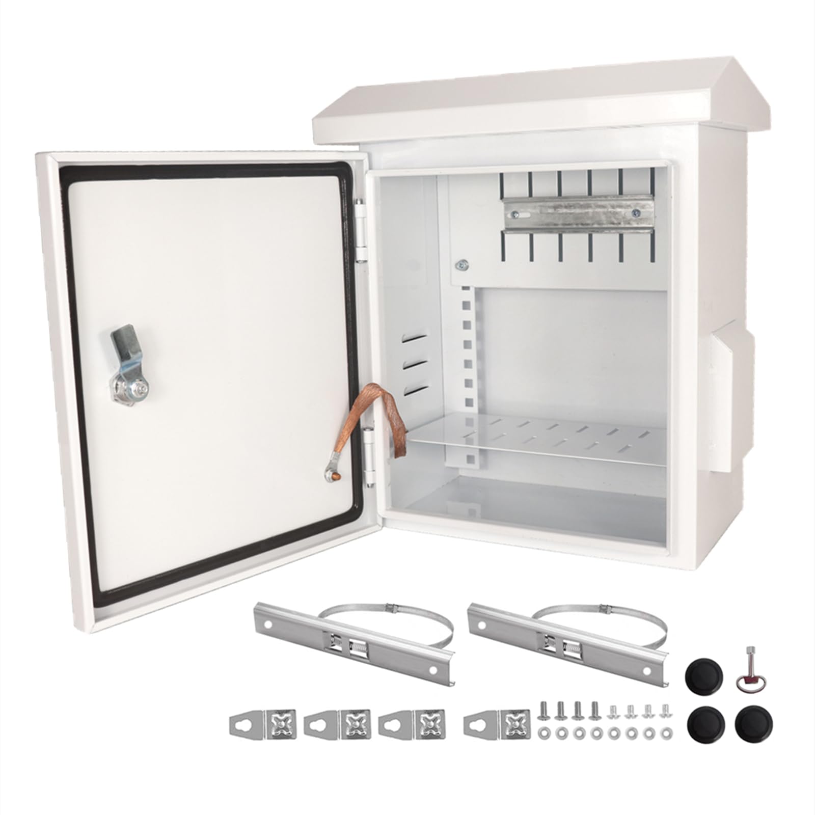 Gabinete eléctrico metálico IP65, construcción robusta en acero galvanizado. Incluye placa de montaje y cerradura.
